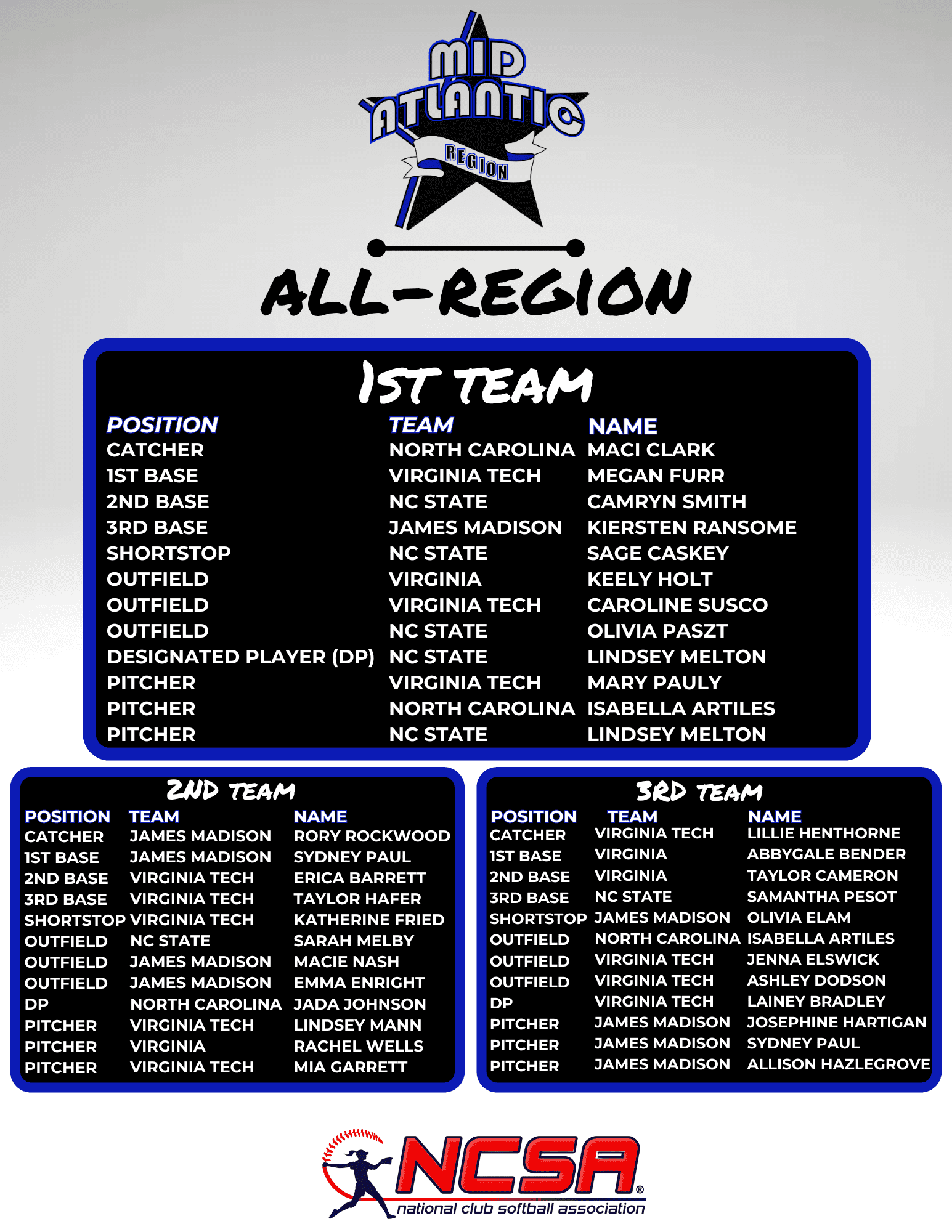 Congratulations to all those who earned 1st, 2nd and 3rd Team honors on the 2023-2024 Mid-Atlantic All-Region Teams!