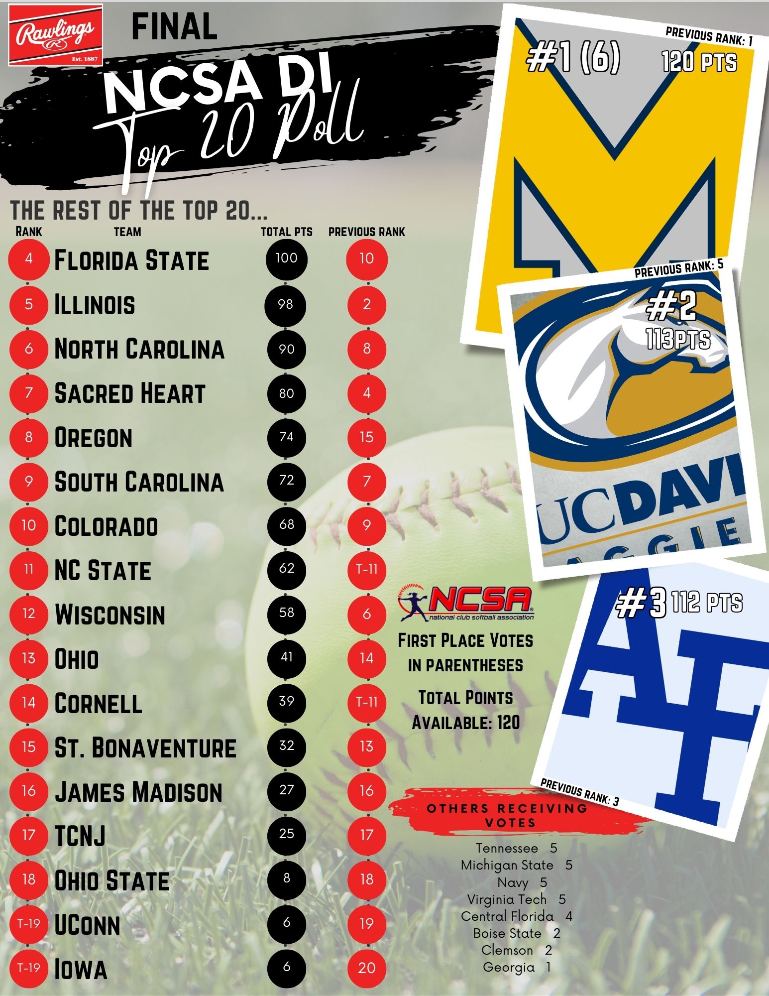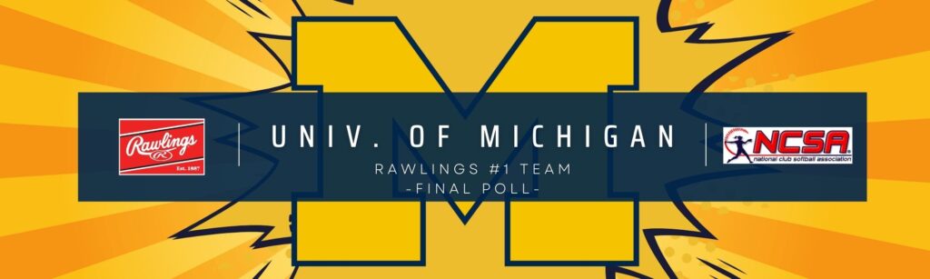 Your 2024-2025 NCSA Division I National Champions, the University of Michigan Wolverines are the #1 Team in the Rawlings Final NCSA DI Top 20 Poll! Michigan was dominant all year long not having lost a game since October. They took over #1 ranking in March and never relinquished that title, finishing the year 30-1 (14-1 conference). An incredible season for the Wolverines and one that they will never forget.