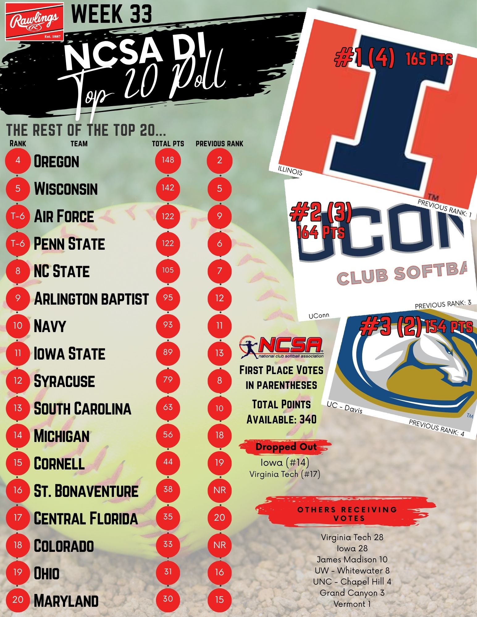 As we head into Regionals weekend, 3 teams receive 1st place votes with Illinois leading the way and UConn and UC – Davis following. There’s a lot of shuffling in the Top 20 with 2 new teams joining the fold.